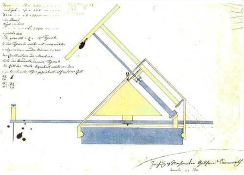 The actual instrument constructed by Hermann disappeared during the mid-nineteenth century, but we do have an original diagram of one elevation of the planimeter (Figures 1 and 2). In the diagram, the cone is shown side-on (the yellow triangle), and rotates in proportion with the left to right displacement of the pointer shaft. As the pen moves in and out of the drawing, the cone moves along a track (the blue rectangle). This pulls the wheel over a wedge (shown in blue on both diagrams) causing the wheel to move up and down the cone. Since the cone and wheel form a variable gear, the rate of the wheel’s rotation is dependent on both the rate of change of the wheel and the displacement of the wheel along the track. This enables the device to function as an area calculator or integrator.