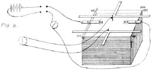 Adams’ tank further contributed to the approach of visualising electrical field lines. It consisted of a wooden tank containing water, two fixed metal electrodes, and two mobile electrodes. Connecting a power source to the fixed electrodes established an electrical field, which could then be explored with the mobile electrodes. (See Figure 10: the fixed electrodes are marked A and B, the mobile electrodes are connected to the T-shaped handles.)