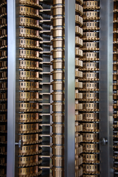 In Babbage’s calculating engines numbers are represented by figure wheels engraved with the numbers ‘0’ through ‘9’, arranged in vertical stacks or columns, with one wheel for each digit of the number (see Illustration 2).19 The columns stand alongside one another and are coupled with internal gearing and control mechanisms that orchestrate the motion of the wheels to perform the repeated additions required for tabulation by method of differences. The broadside view of the Engine presents a rectangular matrix of figure wheels representing the value of the tabular value in one column, the first difference in the next column, second difference the next column, and so on. The matrix of wheels suggests that apart from the internal gearing for repeated addition, individual figure wheels can influence others by external connection. Specifically, by externally gearing wheels together, any given figure wheel (representing units, tens, hundreds etc of a given number) could add its value to a wheel in another column.