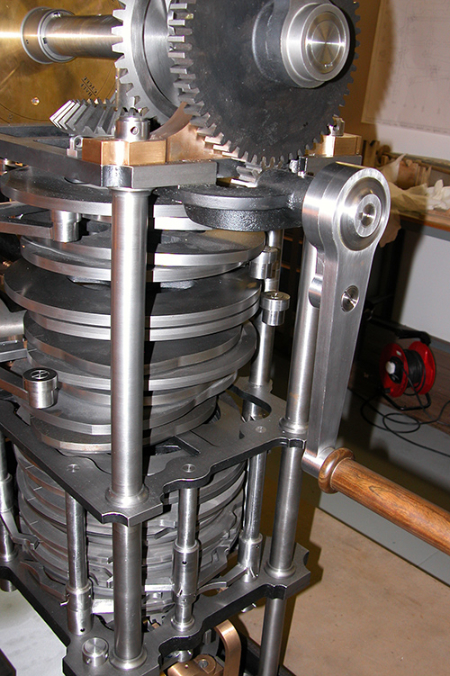 There is no indication that Babbage physically implemented such cross-coupling on his first experimental model during 1822, and the early exploration appears to have been a pen-and-paper speculation. However, the portion of Difference Engine No. 1, assembled by Clement in 1832, clearly shows the additional axes and gears that allow such cross coupling that were added when Babbage returned to these ideas, after a decade of distraction constructing the larger machine.21