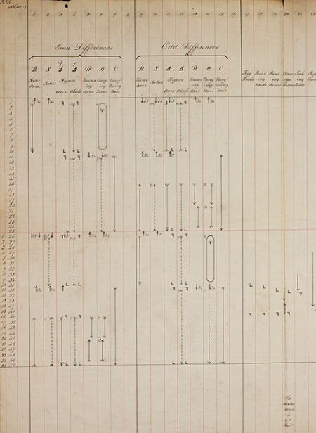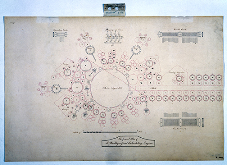 Babbage regarded the Notation as a universal descriptive language of interaction not confined to science or engineering. In the context of the origins of computing, the Notation represents a serious attempt at formal symbolic representation of computational logic. The Notation is not a calculus but a symbolic description that exactly records how parts are interconnected and the way they are intended to interact. The Notation has three main forms. One form is that of a timing diagram which describes how motions of parts are phased and orchestrated in relation to each other (see Illustration 15). Another has the form of a flow diagram. The example in Illustration 17 traces each drive train for printing and stereotyping apparatus between 1847 and 1849 for both the Analytical Engine and Difference Engine No. 2. The apparatus, which consists of 4,000 separate parts, automatically typesets the results of the calculation, prints hardcopy results to thirty decimal places, and impresses the results in two font sizes into stereotype moulds for making printing plates (see Illustration 16). The format of the output is programmable, with variable line height, margin widths, number of columns, whether the results are line-to-line with automatic line wrap, or column-to-column with automatic column wrap, and an optional blank line every n-lines for ease of reading. (The output apparatus described was completed in 2002 built to the original designs and is shown in Illustration 18).38 The diagram clearly distinguishes control inputs and data inputs. The data inputs are the outputs from the calculating section. The final form of the Notation is a tabular form usually included on the same design drawings alongside the mechanisms it describes (see Illustration 19).