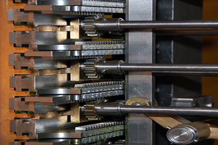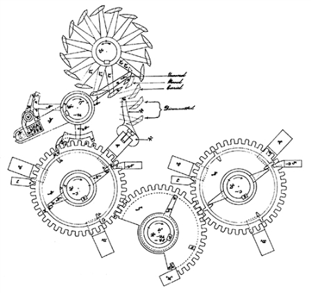A technique that Babbage regarded as amongst the most difficult challenges of the early designs was that of the ‘anticipating carriage’ and he ranked its accomplishment as a major breakthrough in both technique and self-confidence.32 In the Difference Engines the carriage of tens is handled digit by digit in a fixed sequence. He refers to the technique as ‘successive carriage’. Babbage was ruthless in his attempts to minimise execution time. In the successive carriage technique the serial polling of each digit was time-consuming. The anticipating carriage mechanism is not what we would now call ‘look ahead’ but it allows all tens carries in a multi-digit register to be performed in a single operation and is therefore more time-efficient. As with the successive carriage, anticipating carriage automatically caters for secondary carries, that is, carries that result from carries (see Illustration 9).