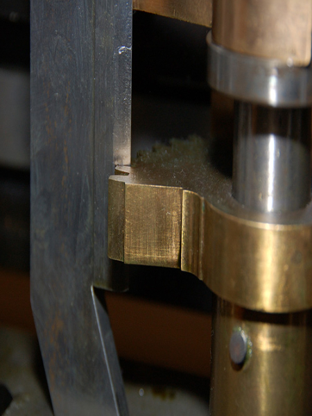 By 1847 the thinking had refined and in Difference Engine No. 2 a different technique was used. Here no attempt is made to exclude intermediate transitional positions of the figure wheel during normal rotation. Instead a wedge is driven between the teeth of each figure wheel at critical points in the cycle (see Illustration 12). The effect of the wedge (called a lock) is threefold: it ensures continuous minor correction; it locks the wheel to freeze its value; and performs error detection. The entry of the lock between teeth corrects small derangements of the geared wheels that might arise from vibration, episodic external disturbance or wear, and the act of entry provides a self-correcting feature designed to prevent cumulative derangement from integral digit values. An electronic analogy can be found in electronic pulse-shaping where leading and trailing edges of are ‘squared up’, as it were, to prevent progressive degradation. In the case of more extreme derangement the wedge performs error detection. When the derangement exceeds 2¼ degrees the figure wheel is in a position intermediate between digit values and is invalid. The entry of the wedge will strike the tooth edge on and the Engine will jam as it designed to do. Jamming of the locks is a form of error detection and signals that a wheel is in an indeterminate and therefore undefined position and the digital integrity of the process has been compromised. At various points in the cycle locks are fully inserted between the gear teeth to lock the wheels immovably in their current position. Wedge-shaped locks of this kind are used throughout Difference Engine No. 2 in both the calculating section as well as the printing and stereotyping apparatus to ensure digital integrity. Such was Babbage’s confidence in his security mechanisms that he boasts that the Engine cannot be deranged even by deliberate intervention, even when running—that it ‘will calculate rightly or not at all’,34 and ‘what it would do it would do truly’ (see Illustration 13 and Illustration 14).35
