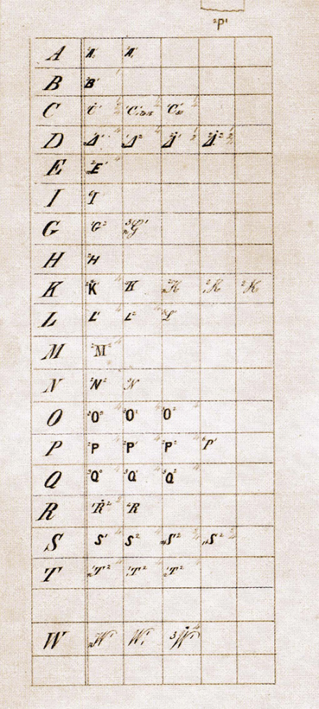 There is little in the way of detailed explanation of the Notation in Babbage’s writing but he did record the principles and general guidelines, and left prolific examples of its use. In the tabular form individual parts are identified with a capital in one of at least three alphabetic forms, Roman, Etruscan (sans-serif), and a form of copperplate script. Upright letters identify framing pieces, inclined letters identify moveable parts. The subscripts and superscripts on each letter record the part's identity, form, relationship to other parts, and motion. The tabular form is at component level. The flow diagrams and timing diagrams can be seen as system-level descriptions.