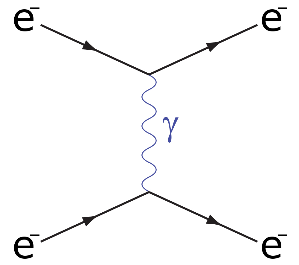 The theory may be simply illustrated with the use of so-called “Feynman diagrams”, such as the one shown in Figure 15. This shows an interaction between two electrons, so-called Möller scattering. One of the electrons spontaneously emits a photon. In so doing, it recoils. The photon is subsequently absorbed by the other electron and it then recoils. In this way the electron-electron interaction is accounted for by the exchange of a photon, and the conceptual problem of “action at a distance” is avoided.